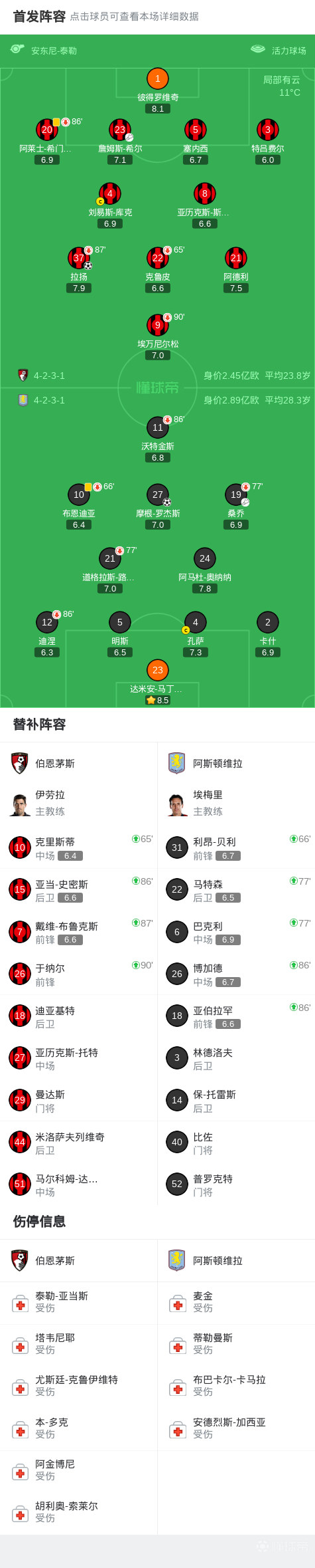北京时间2月7日英超联赛第25轮,伯恩茅斯主场对阵阿斯顿维拉。摩根-罗杰斯小角度劲射破门先拔头筹,拉扬射门击中横梁,随后低射破门扳平比分,大马丁献神扑。最终,伯恩茅斯主场1-1战平阿斯顿维拉。