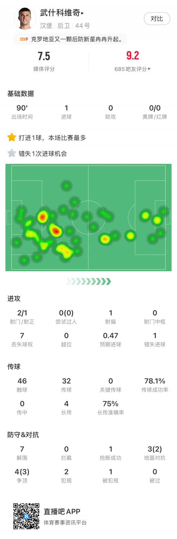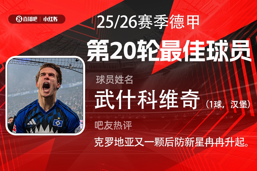 第20轮评选结果出炉,18岁热刺外租小将武什科维奇破门,攻防两端发挥俱佳,帮助汉堡逼平拜仁。武什科维奇当选【直播吧X小红书德甲第20轮最佳球员】!
