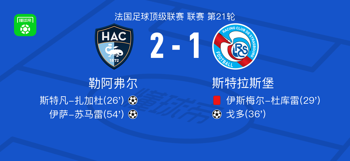 北京时间2月9日法国足球顶级联赛第21轮,勒阿弗尔主场迎战斯特拉斯堡。比赛中,勒阿弗尔球员通过配合由斯特凡-扎加杜率先破门;随后斯特拉斯堡一名球员吃到红牌,人数处于劣势;不久后斯特拉斯堡球员戈多扳平比分;下半场勒阿弗尔再通过配合由伊萨-苏马雷打入制胜球。最终勒阿弗尔2-1战胜斯特拉斯堡。
