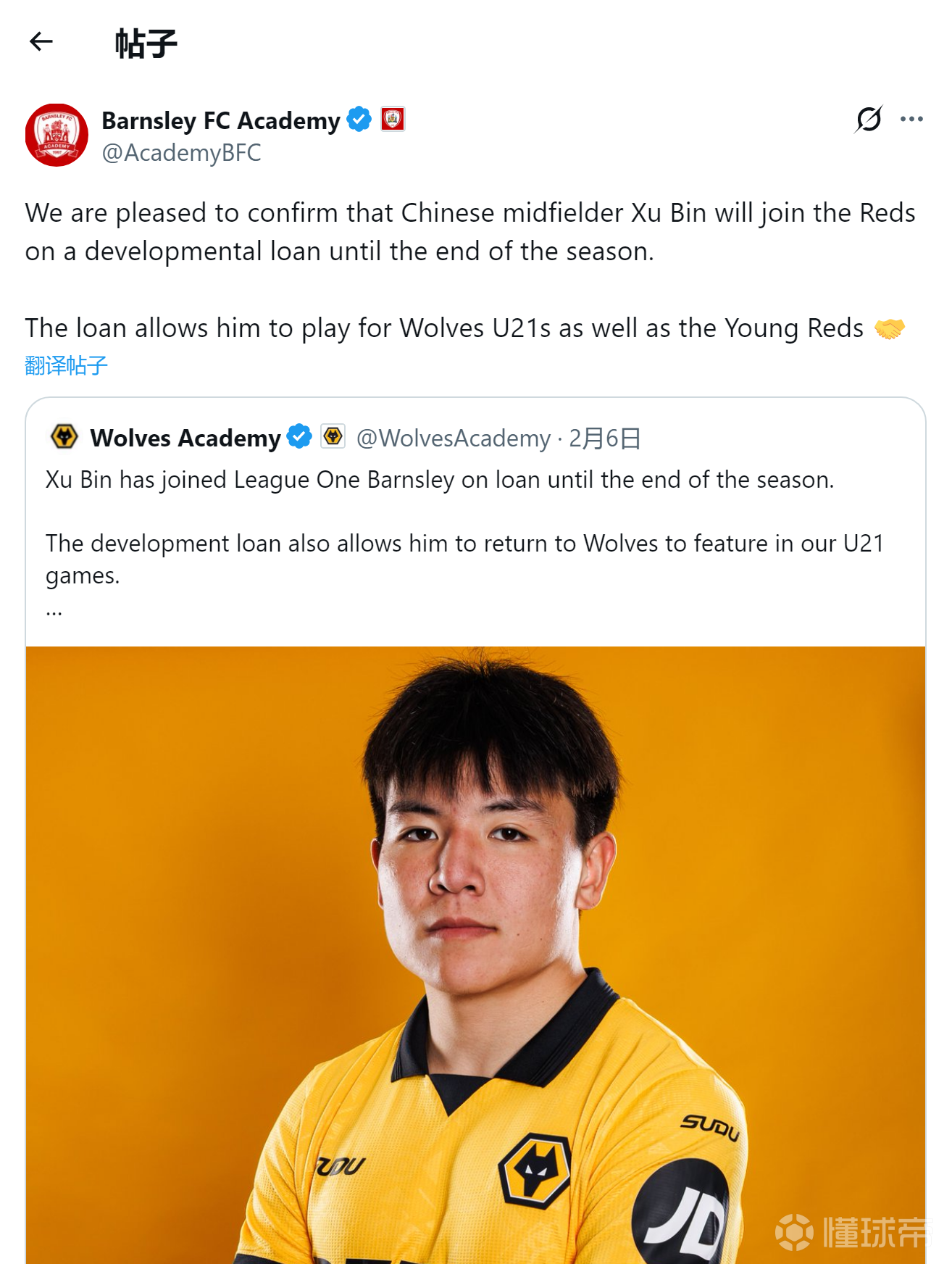 #徐彬租借加盟巴恩斯利# 职业发展联赛(PDL)由20支第二级别青训学院球队组成,巴恩斯利U21队主要参加该赛事。联赛分为南北两区,每队和同区球队进行主客两场比赛、和不同区球队进行一场比赛,28轮后按总积分榜排名决定常规赛冠军。本赛季,巴恩斯利U21队战绩欠佳,目前3胜5平8负、进28球丢40球,排名第17位。常规赛还剩余12场比赛。为了促进球队交流,本赛季新增跨级别淘汰赛——前八名球队将与英超U21联赛第17至24名的八支球队进行淘汰赛,胜者加冕职业发展联赛冠军。