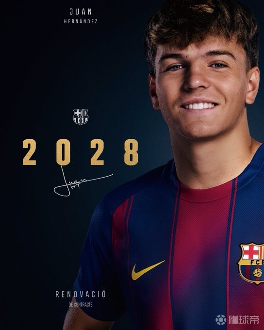 巴萨官方发布公告,巴塞罗那足球俱乐部完成与中场球员胡安-埃尔南德斯的续约工作。双方签署新合同,有效期至2028年6月,并包含再延长一个赛季的选择权。