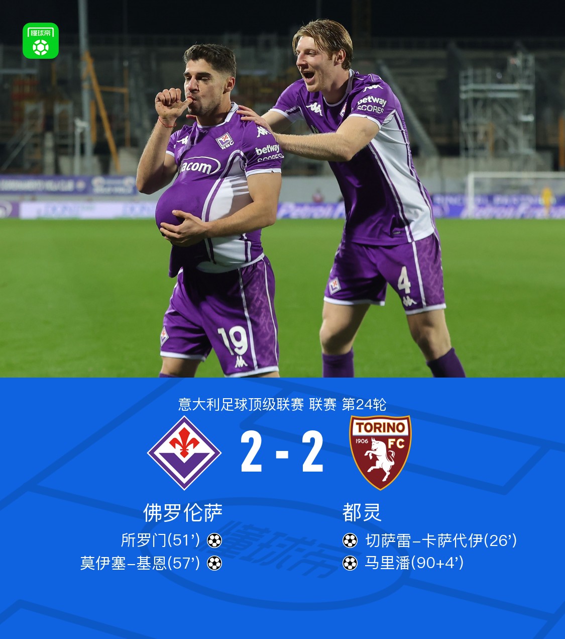 北京时间2月8日意大利足球顶级联赛第24轮,佛罗伦萨主场迎战都灵。上半场,卡萨代伊接伊尔克汗的传中头球破门先拔头筹。下半场,所罗门、基恩连入两球将比分反超。补时阶段,马里潘接吉内蒂斯的任意球甩头破门将比分扳平。最终佛罗伦萨2-2都灵,双方握手言和。