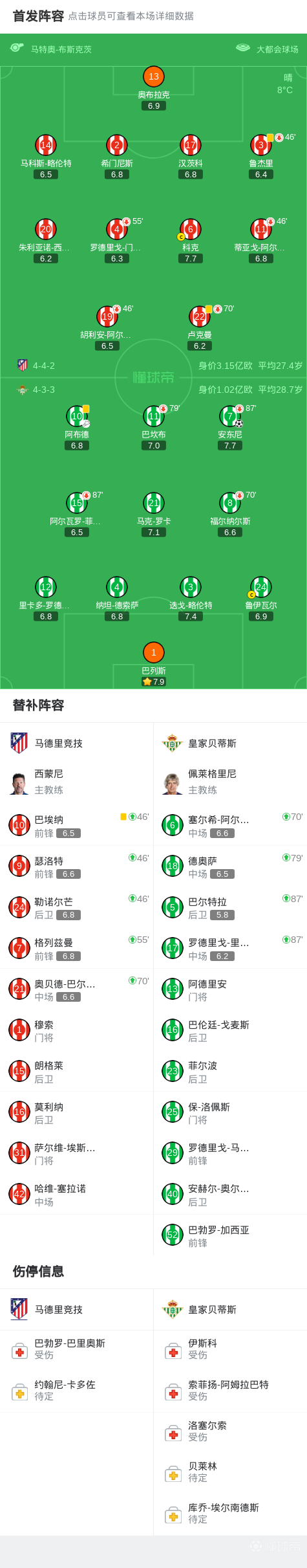 第28分钟,安东尼内切远射破门,贝蒂斯1-0马竞